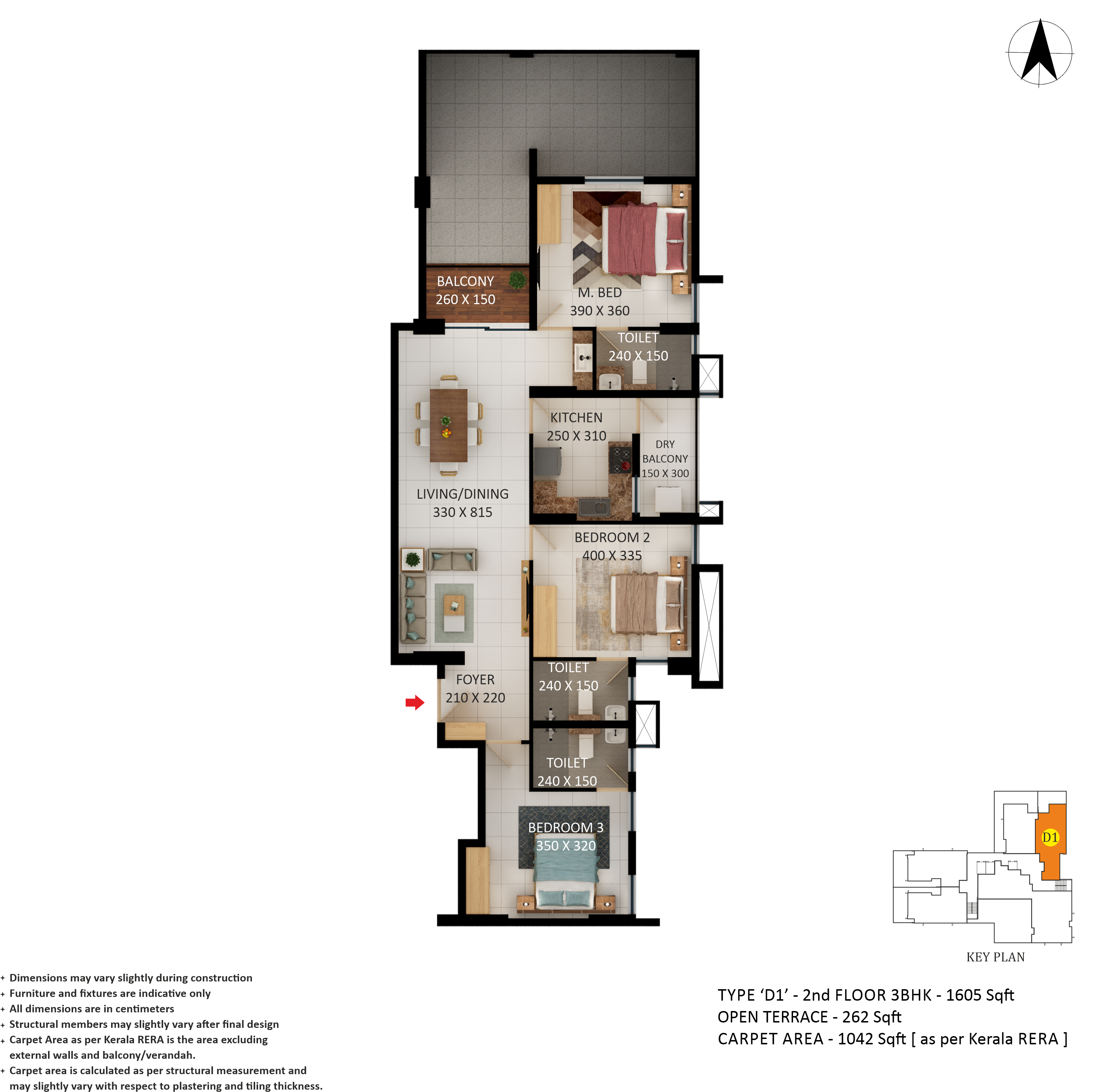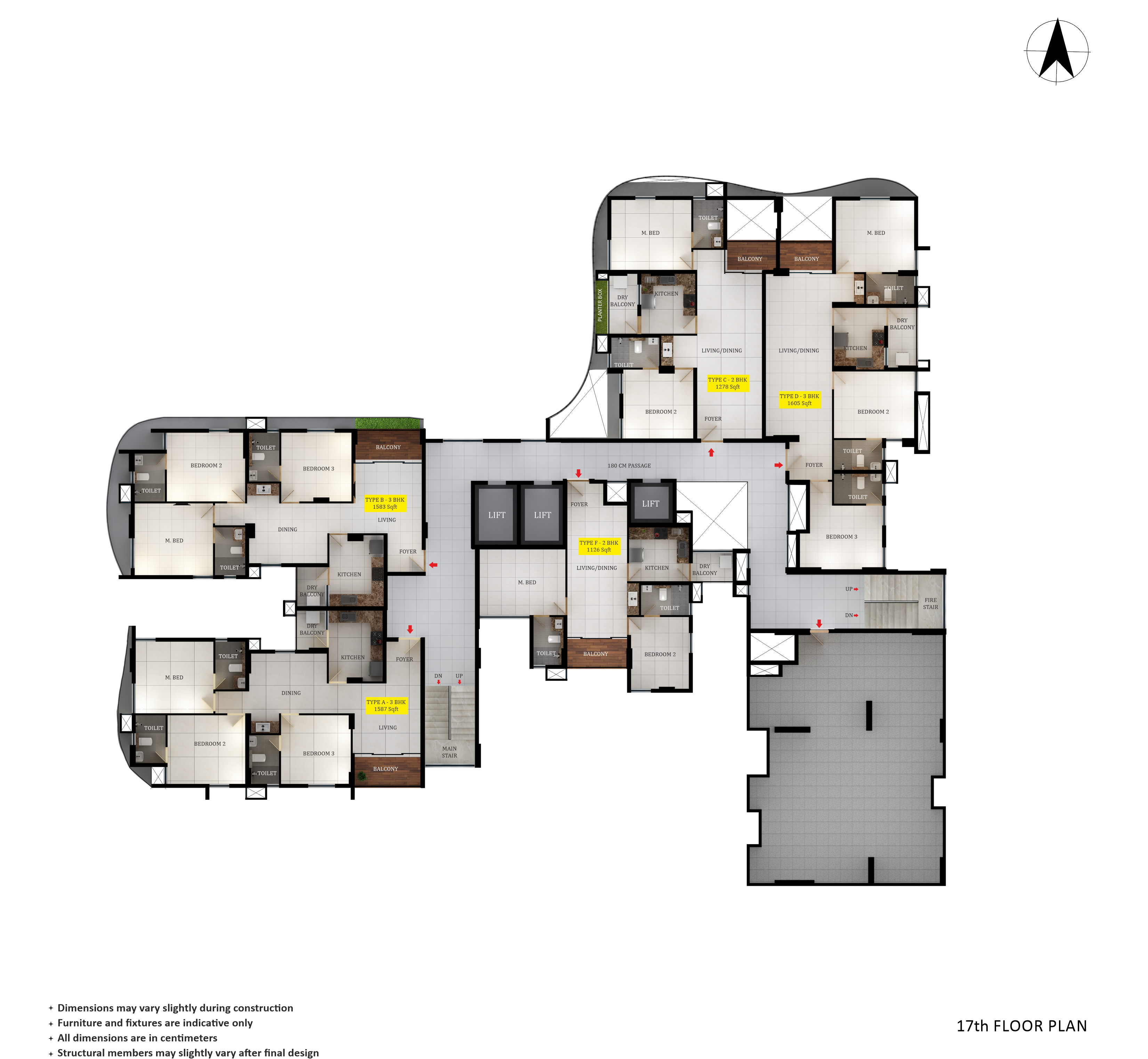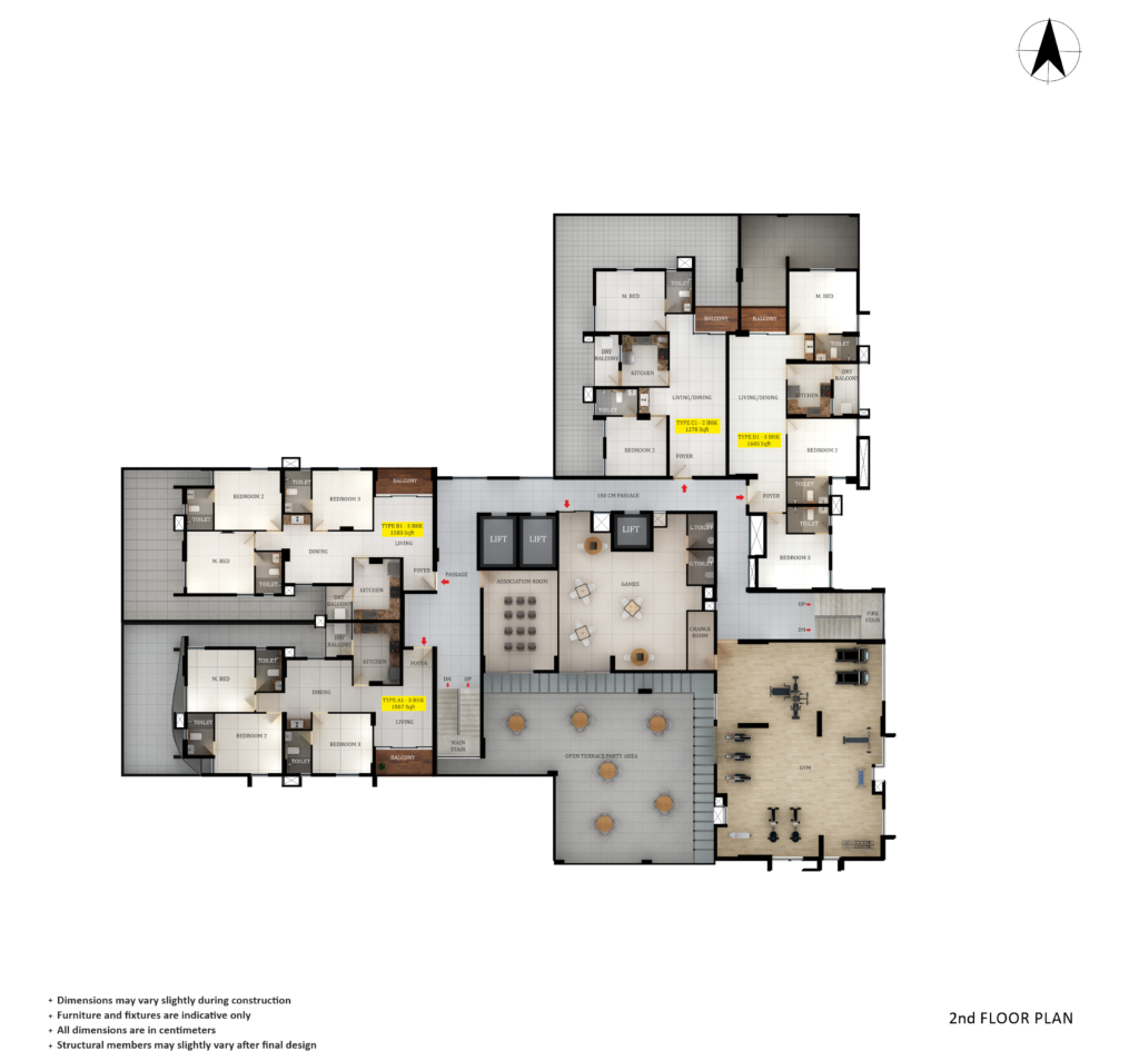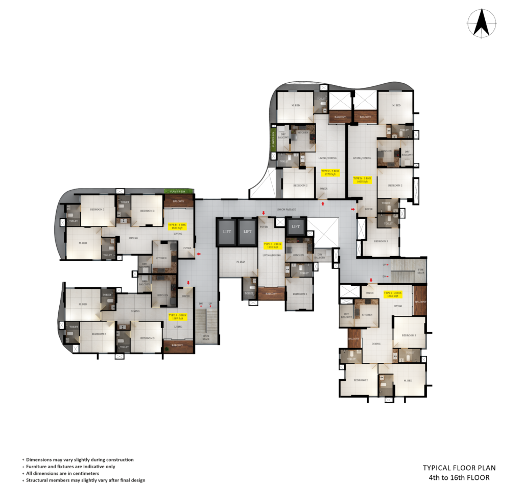 High-quality vitrified/rectified tile flooring with skirting for living, dining and bedrooms. Antiskid/matt tiles—ceramic/vitrified/rectified tiles for kitchens, balconies and toilets. The entrance lobby, staircase and common areas will have granite/vitrified/rectified tile flooring.